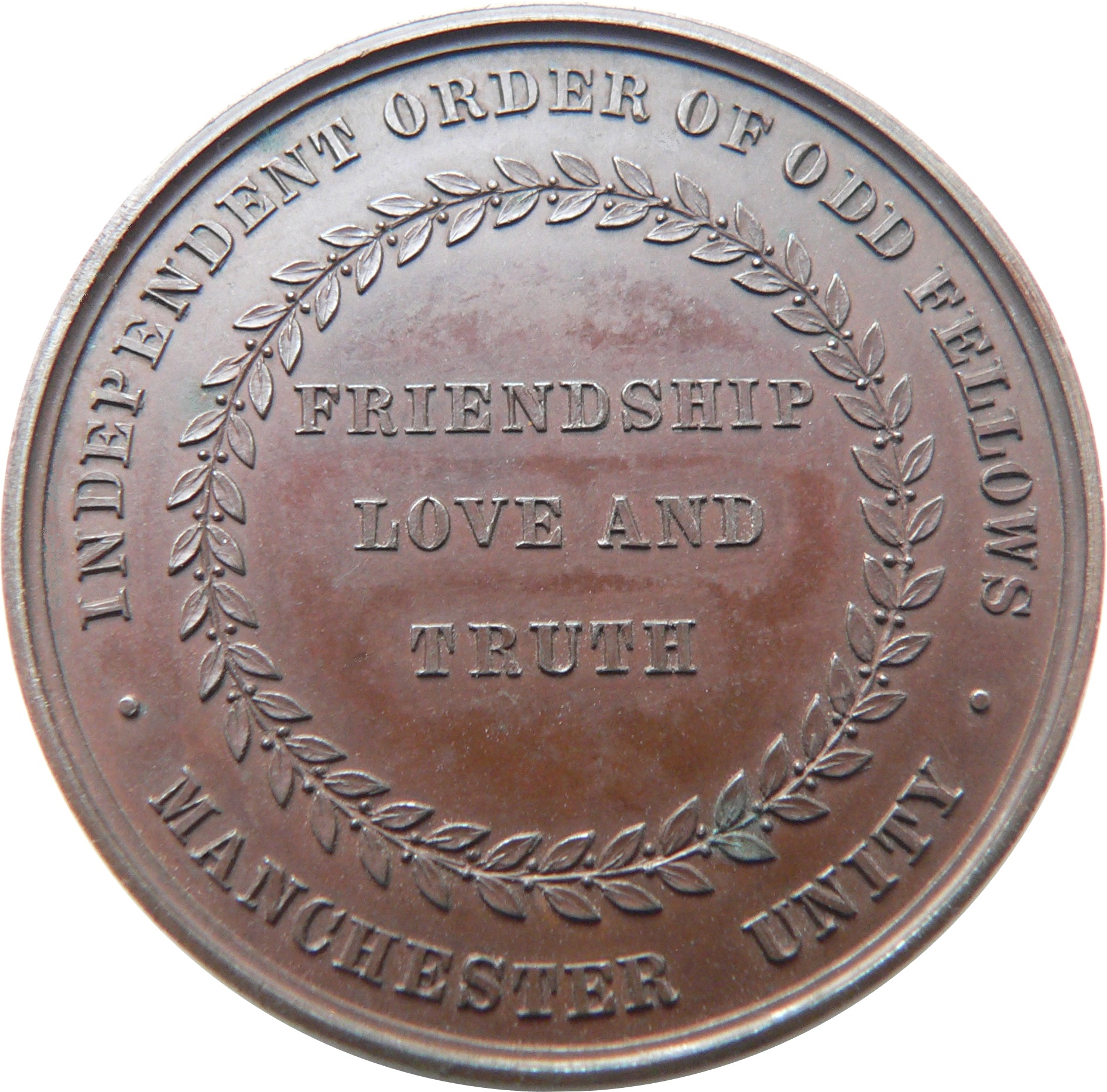 Описание: Приподнятая орнаментальная платформа, на вершине которой изображен щит. Четыре фигуры слева, две справа. Над ними — сияющее всевидящее око, под ним — земной шар в венке. Надпись в экзерге.