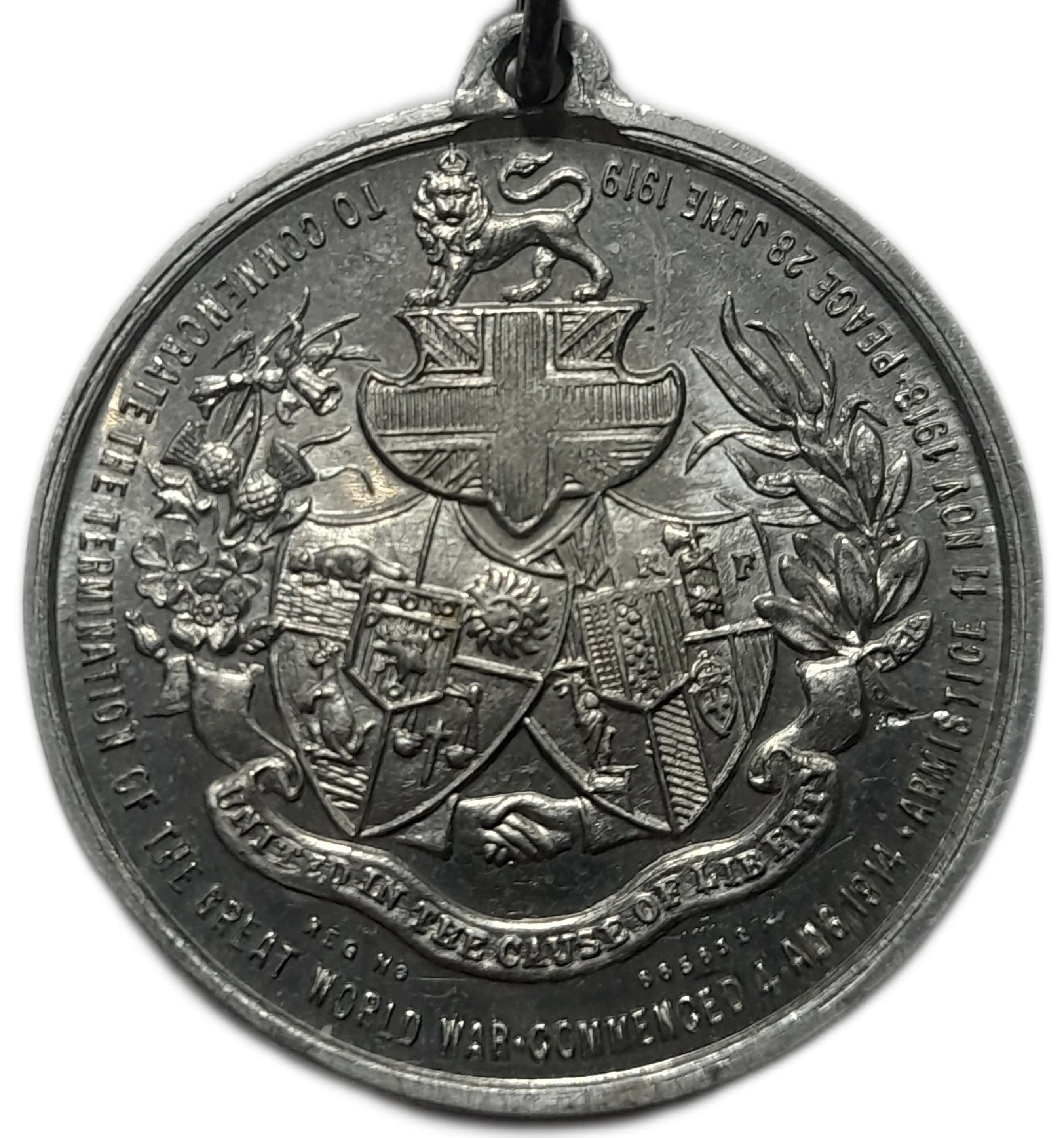TO COMMEMORATE THE TERMINATION OF THE GREAT WORLD WAR • COMMENCED 4 AUG 1914 • ARMISTICE 11 NOV 1918 • PEACE 28 JUNE 1919