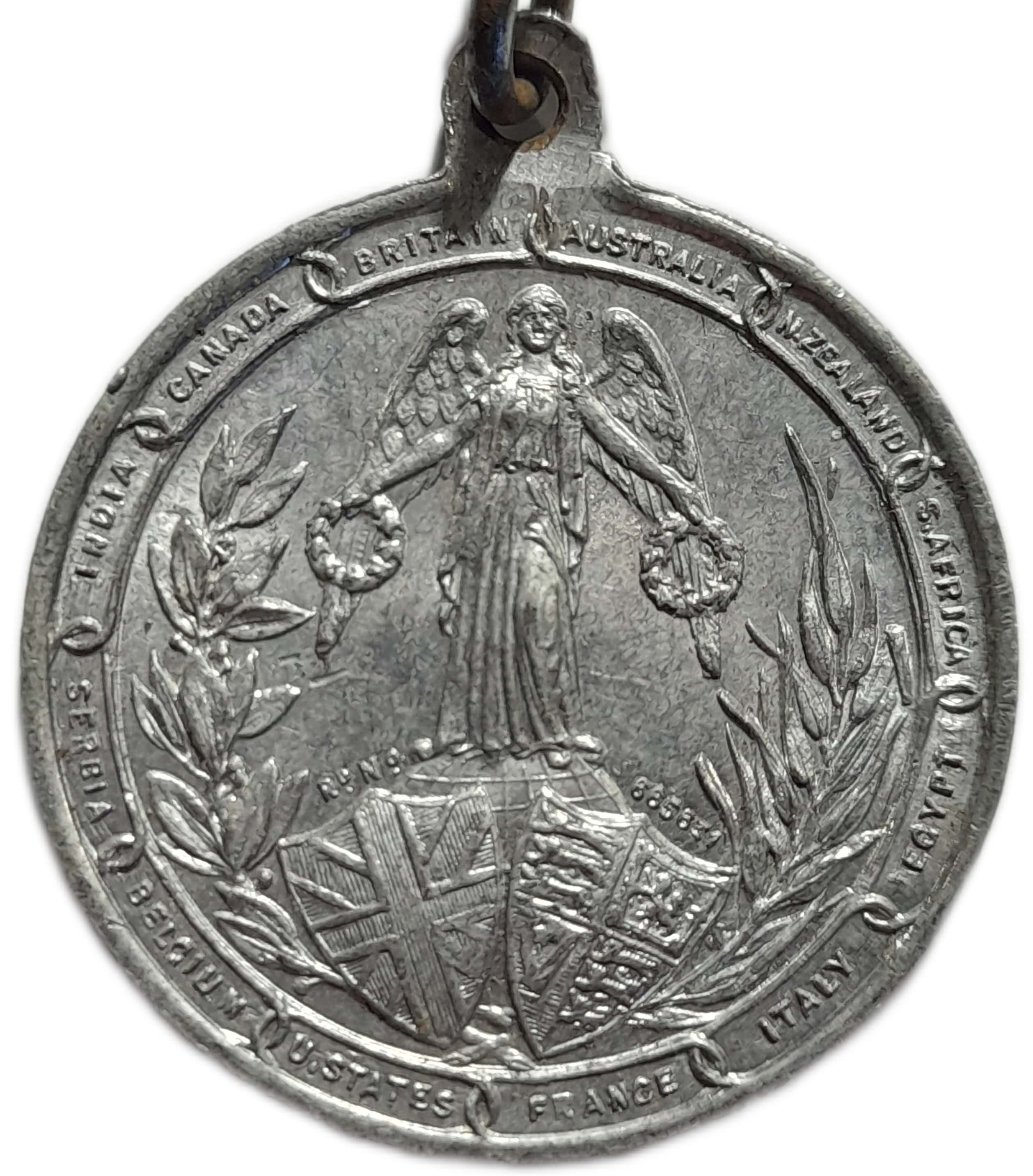 Описание: Фігура Миру стоїть на земній кулі, тримаючи в кожній руці лавровий вінок. Нижче — щити з прапором Союзу та королівським прапором. Усередині вінка з оливкових та пальмових гілок. Напис всередині ланцюжків.