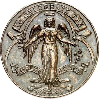 Описание: Фігура Миру стоїть на земній кулі, дивлячись вперед, в правій руці тримає оливкову гілку, а з лівої випускає квіти. За нею арка та німб, зверху та знизу банери.
