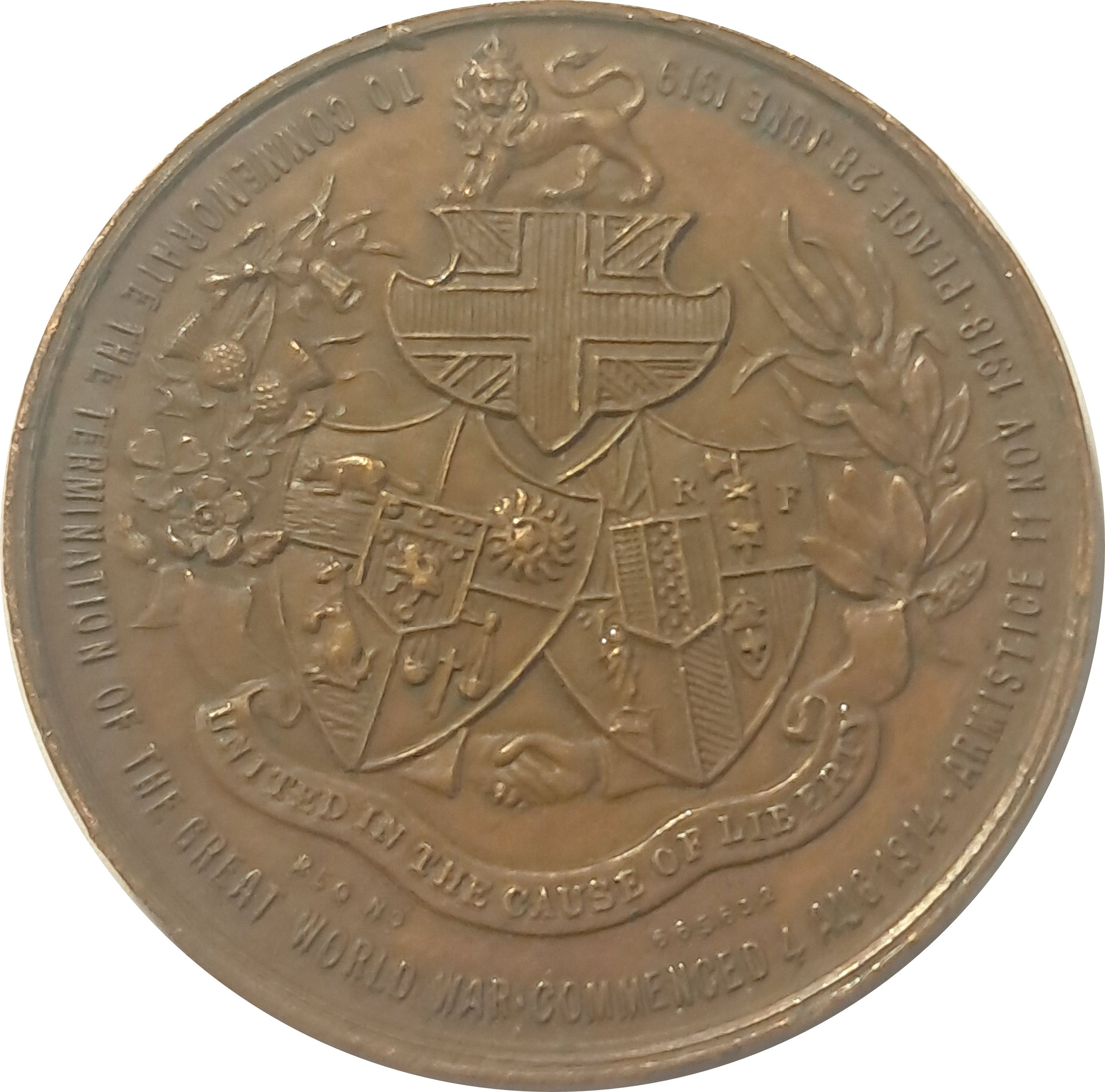 TO COMMEMORATE THE TERMINATION OF THE GREAT WORLD WAR • COMMENCED 4 AUG 1914 • ARMISTICE 11 NOV 1918 • PEACE 28 JUNE 1919