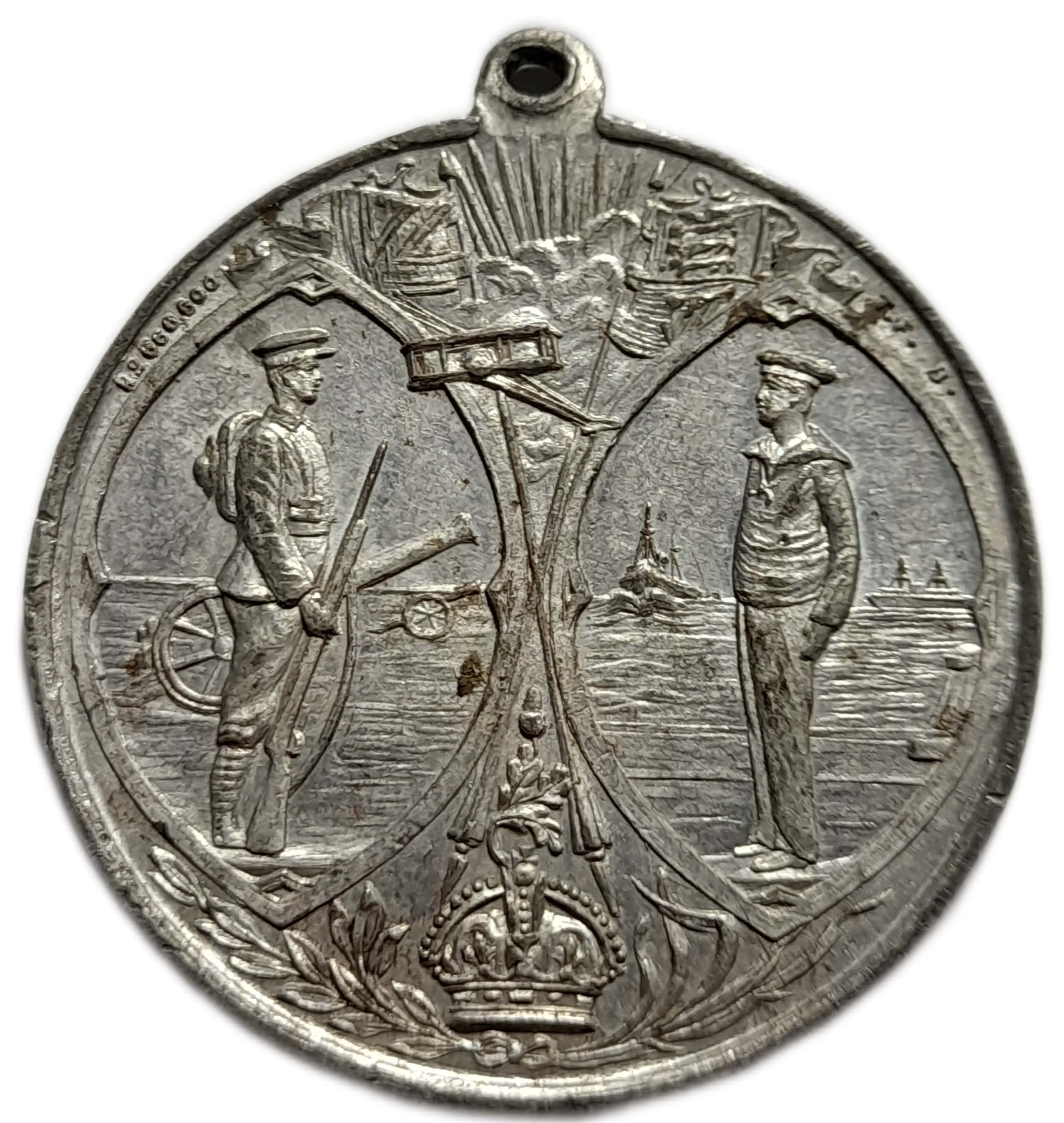 Описание: Два овали, ліворуч стоїть солдат, обернений праворуч, за ним польові гармати. Праворуч стоїть моряк, обернений ліворуч, за ним військові кораблі. Вгорі ліворуч прапор Союзу, праворуч королівський прапор, між ними промені сонця та хмари, а також біплан. Внизу корона з перехрещеними флагштоками та гілками лавра та пальми.