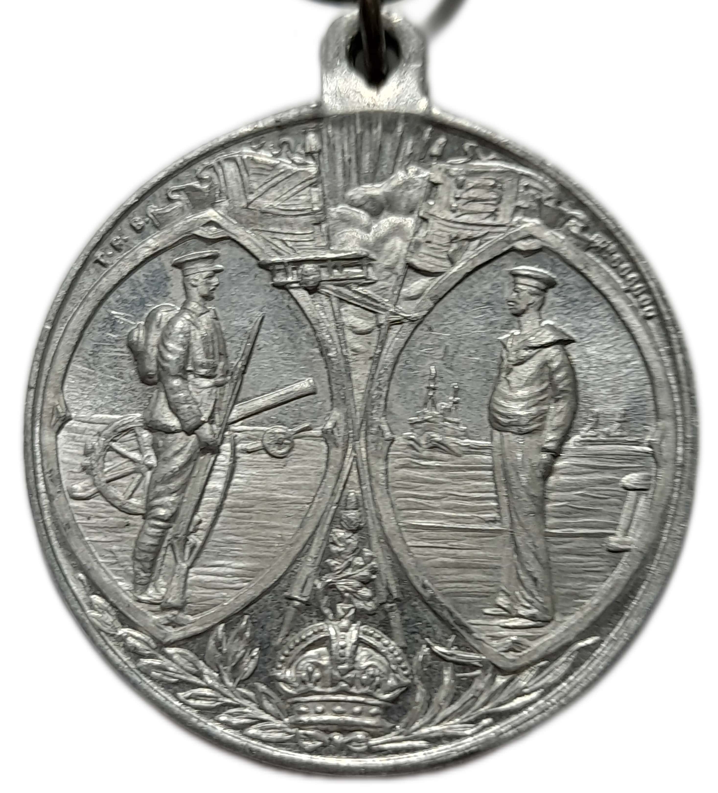 Описание: Два овали, ліворуч стоїть солдат, обернений праворуч, за ним гармати. Праворуч стоїть моряк, обернений ліворуч, за ним військові кораблі. Вгорі ліворуч прапор Союзу, праворуч королівський прапор, між ними промені сонця та хмари, а також біплан. Внизу корона з перехрещеними флагштоками та гілками лавра та пальми.