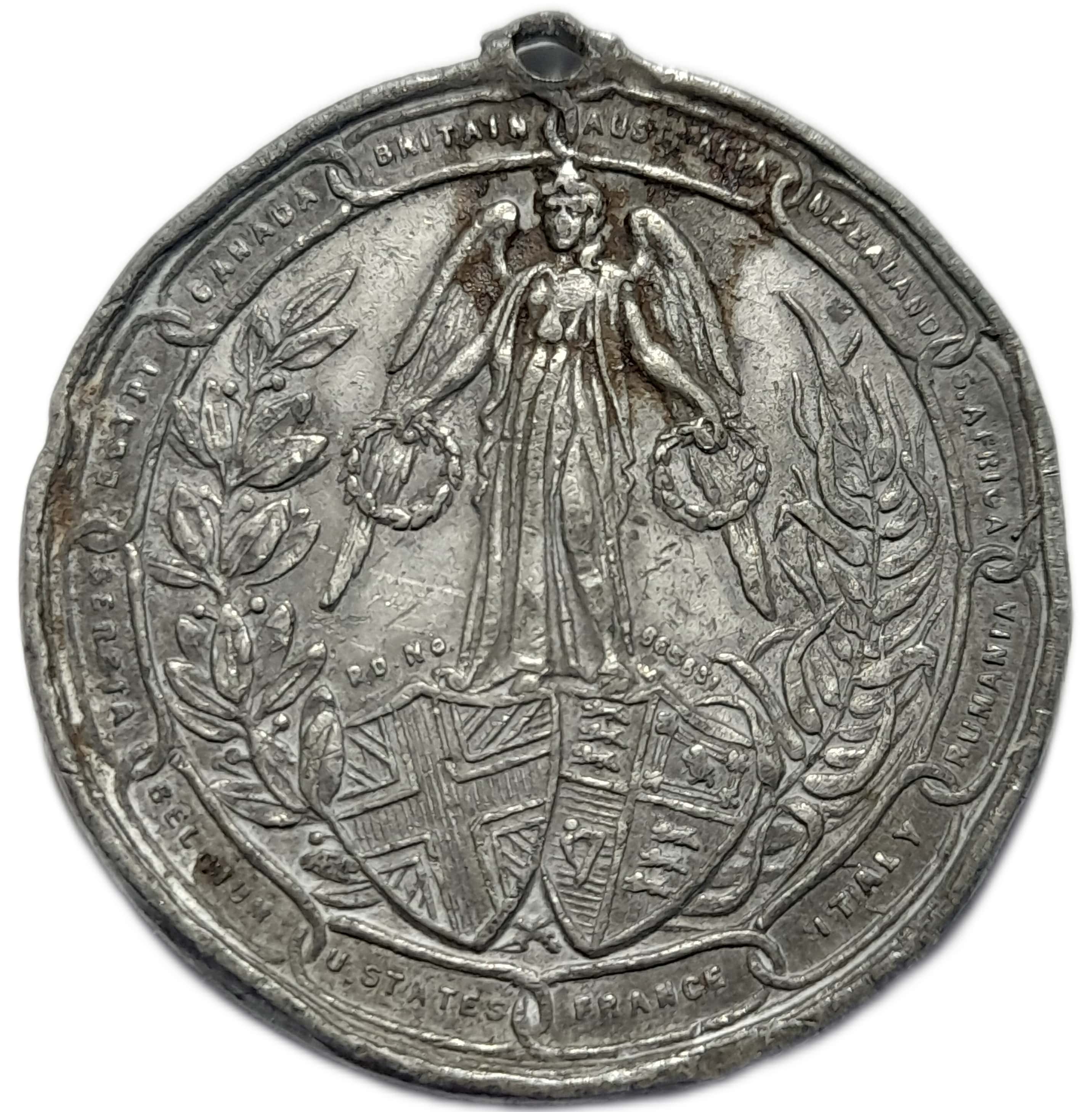 Описание: Фігура Миру стоїть обличчям до глядача з лавровим вінком у кожній руці. Нижче — щити з прапором Союзу та королівським прапором. Усередині вінка з оливкових та пальмових гілок. Напис всередині ланцюжків.