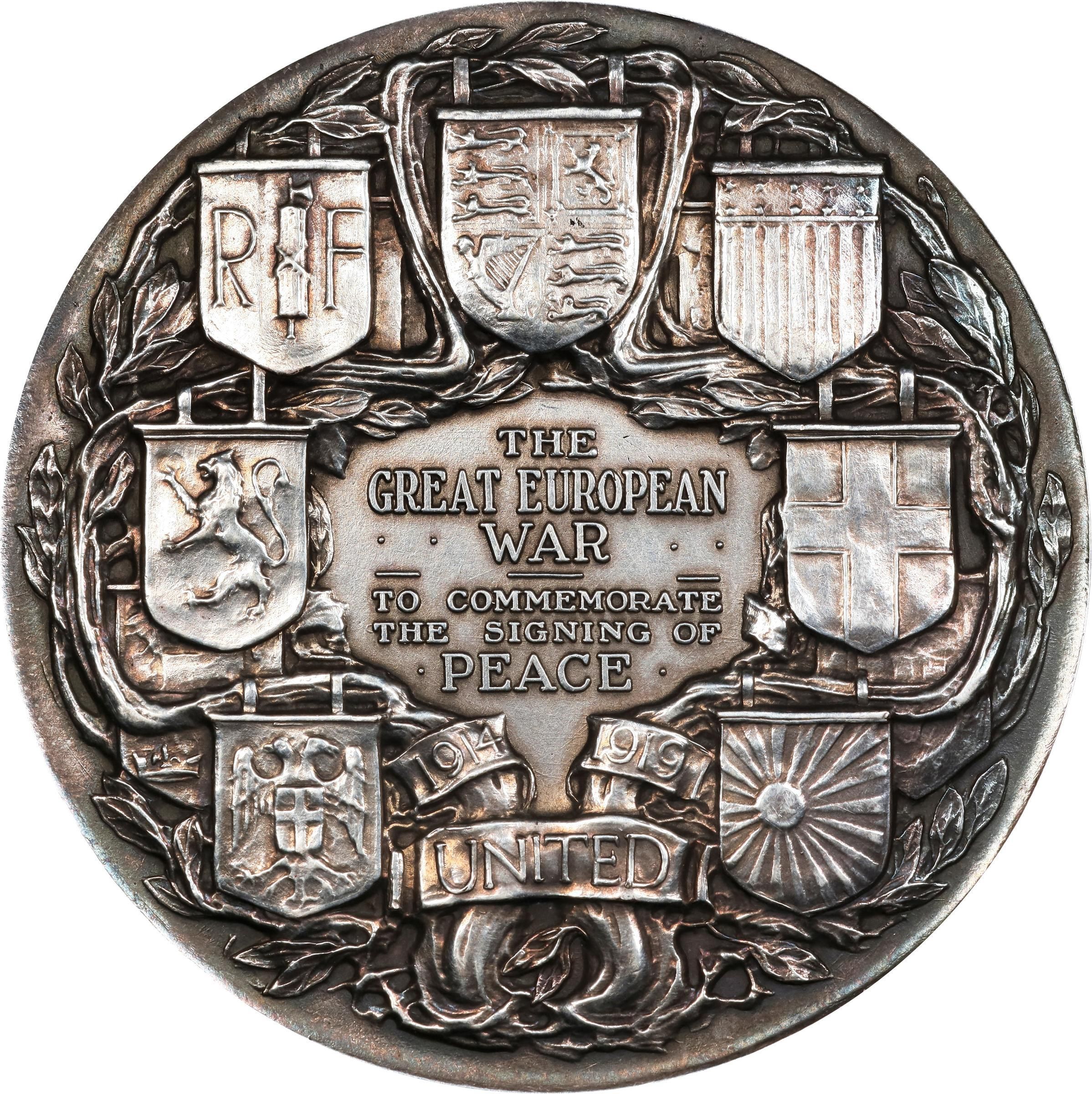 Описание: Британія сидить у центрі на троні, тризуб і щит збоку, отримує згорнутий прапор від пораненого солдата. На задньому плані — військові кораблі, на передньому плані — 2 голуби.