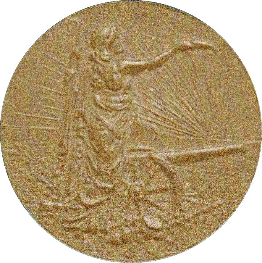 Описание: Мир стоїть обличчям праворуч, у витягнутій правій руці тримає лавровий вінок. У правій руці вона тримає пастуший посох. Поруч з нею стоять польова гармата, солдатська кашкет, гвинтівка, гільза та лаврове дерево.