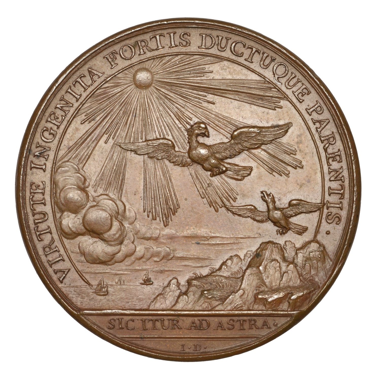 Описание: Бюст принца на пьедестале, по бокам которого стоят Слава и Британия, а над ним — младенец Гений, держащий в руках перья и девиз