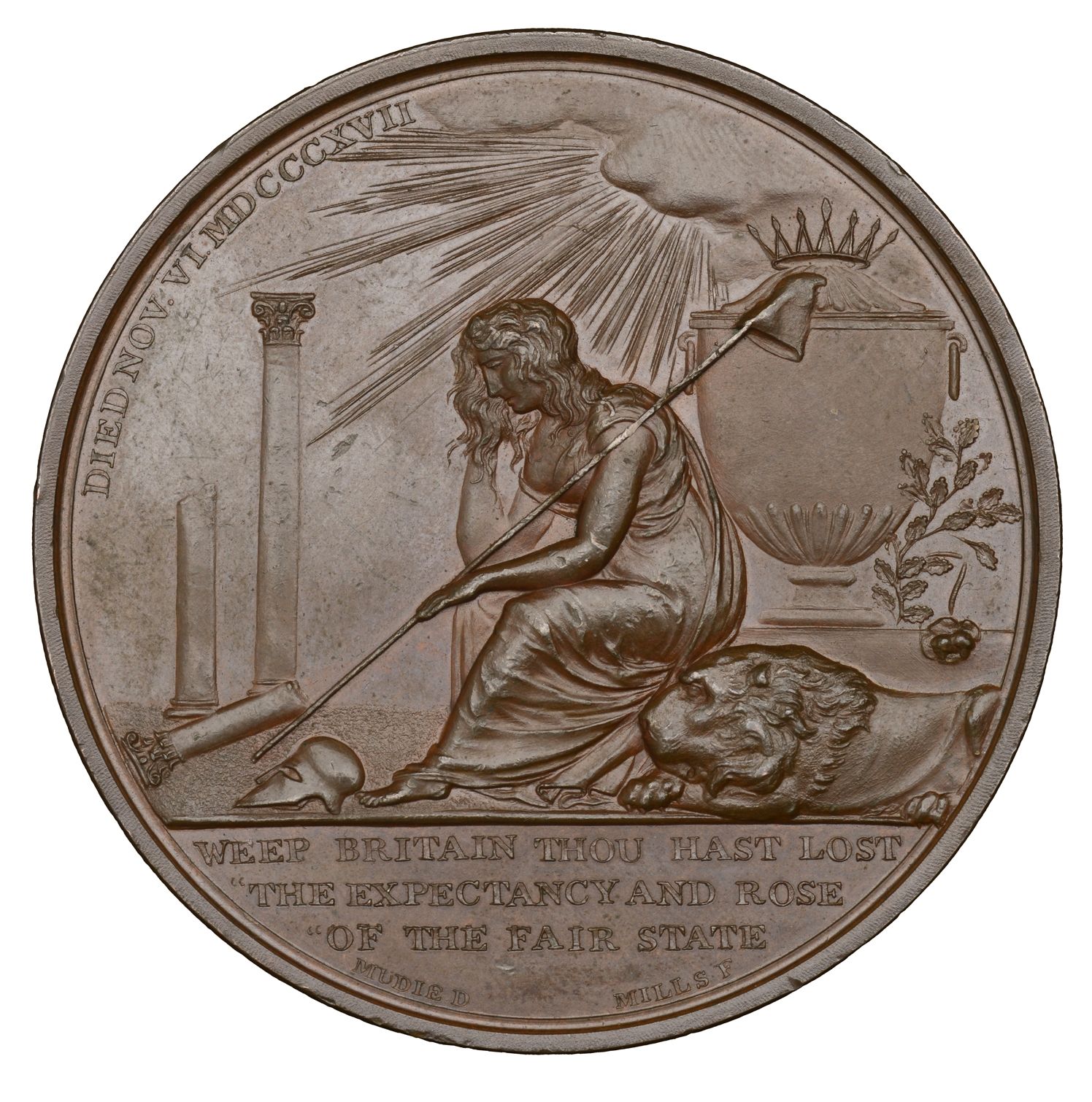 Описание: Британия, сидящая слева и плачущая, рядом с британским львом и сломанной колонной; за ней — урна и облака с лучами