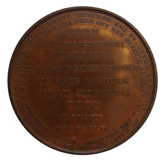 BORN / JANY VII MDCCXCVI / MARRIED . / TO H.S.H. PRINCE LEOPOLD / OF SAXE COBURG / MAY II MDCCCXVI / DIED / NOV . VI / MDCCCXVII.