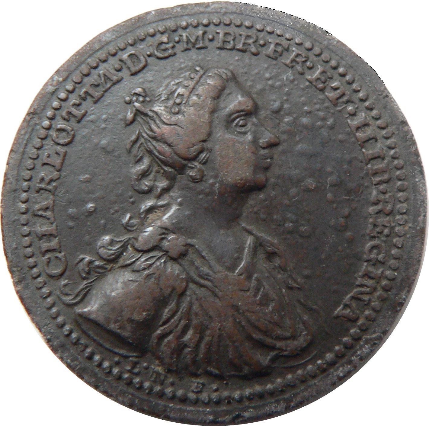 Описание: Бюст королевы Шарлотты в драпировке, обращенный вправо, волосы удержаны лентой с бусинами. Надпись вокруг