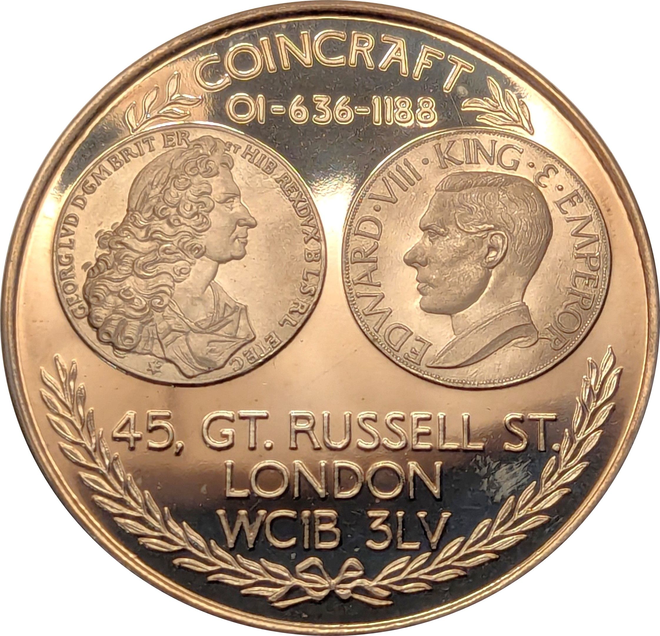 Описание: Гравіювання двох мініатюрних монет із портретами королів Георга I (ліворуч) та Едуарда VIII (праворуч). Текст із назвою та адресою Coincraft. Оточують лаврові листки.