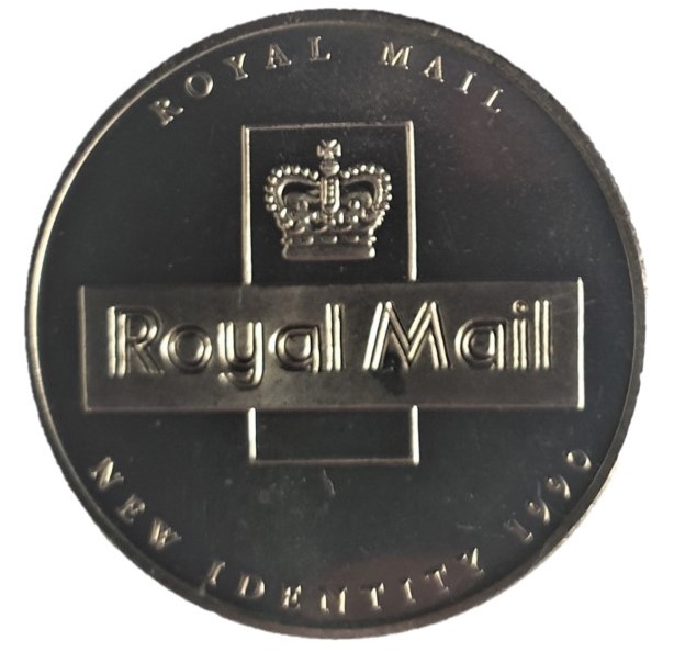 Описание: Royal Mail над короною з мотивом Royal Mail у центрі та написом New Identity 1990 внизу.