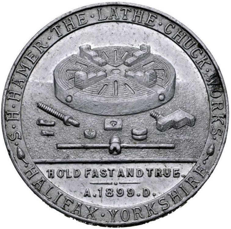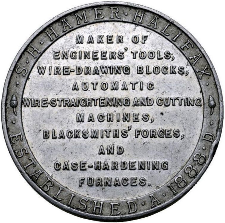 ☙S • H • HAMER • HALIFAX •❧ ESTABLISHED • A • 1888 • D•, MAKER OF ENGINEERS' TOOLS, WIRE-DRAWING BLOCKS, AUTOMATIC WIRE-STRAIGHTENING AND CUTTING MACHINES, BLACKSMITHS' FORGES, AND CASE-HARDENING FURNACES.