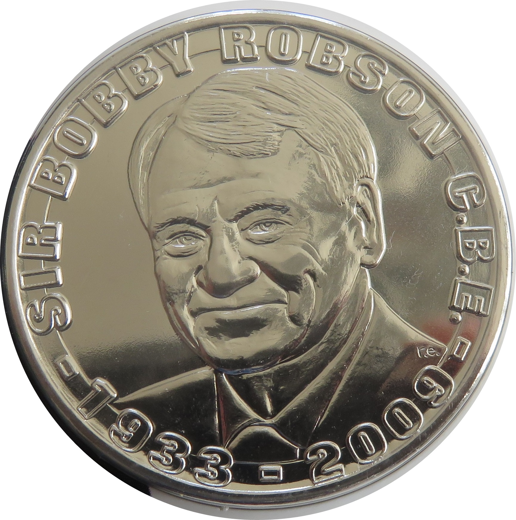 Описание: На лицьовій стороні зображено портрет сера Боббі Робсона з написом навколо.