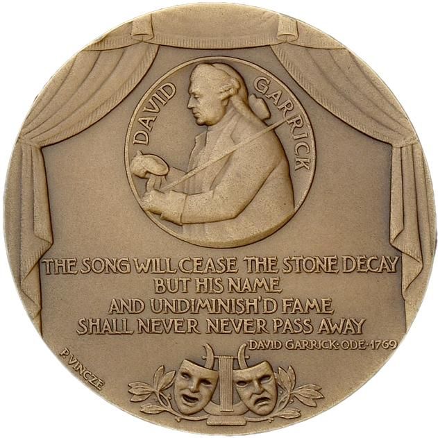 Описание: Бюст слева в медальоне, вокруг — театральные занавеси, маски актеров, лютня и брызги внизу