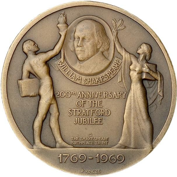 Описание: Две фигуры, стоящие лицом к лицу и держащие факел и розетку, камея с изображением Шекспира между ними