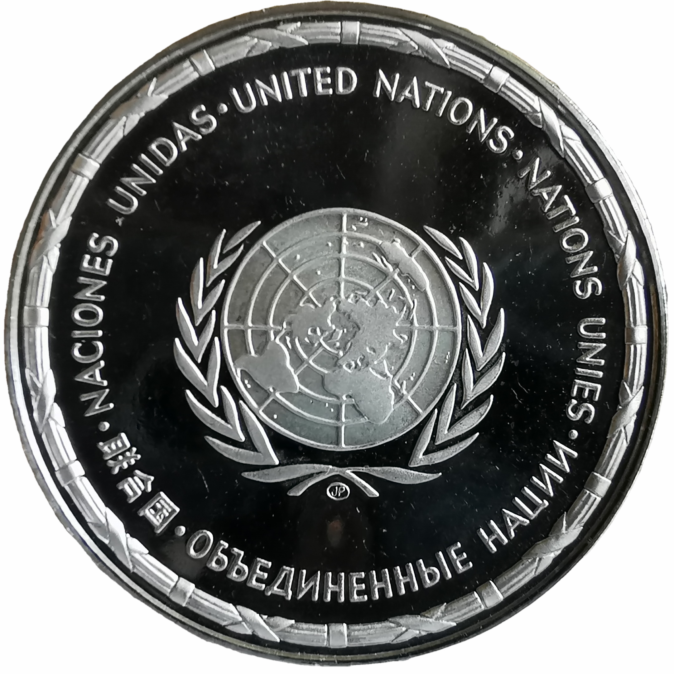 Описание: Логотип Організації Об'єднаних Націй у центрі над вінком з написом «Організація Об'єднаних Націй» 5 мовами (іспанською, англійською, французькою, китайською та російською) по периметру монети.