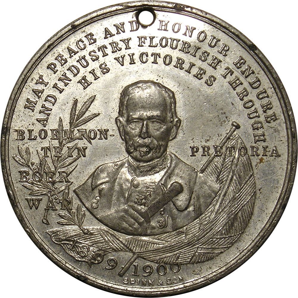 Описание: Бюст лорда Робертса в уніформі, який тримає жезл фельдмаршала, під ним — прапор Великої Британії.
