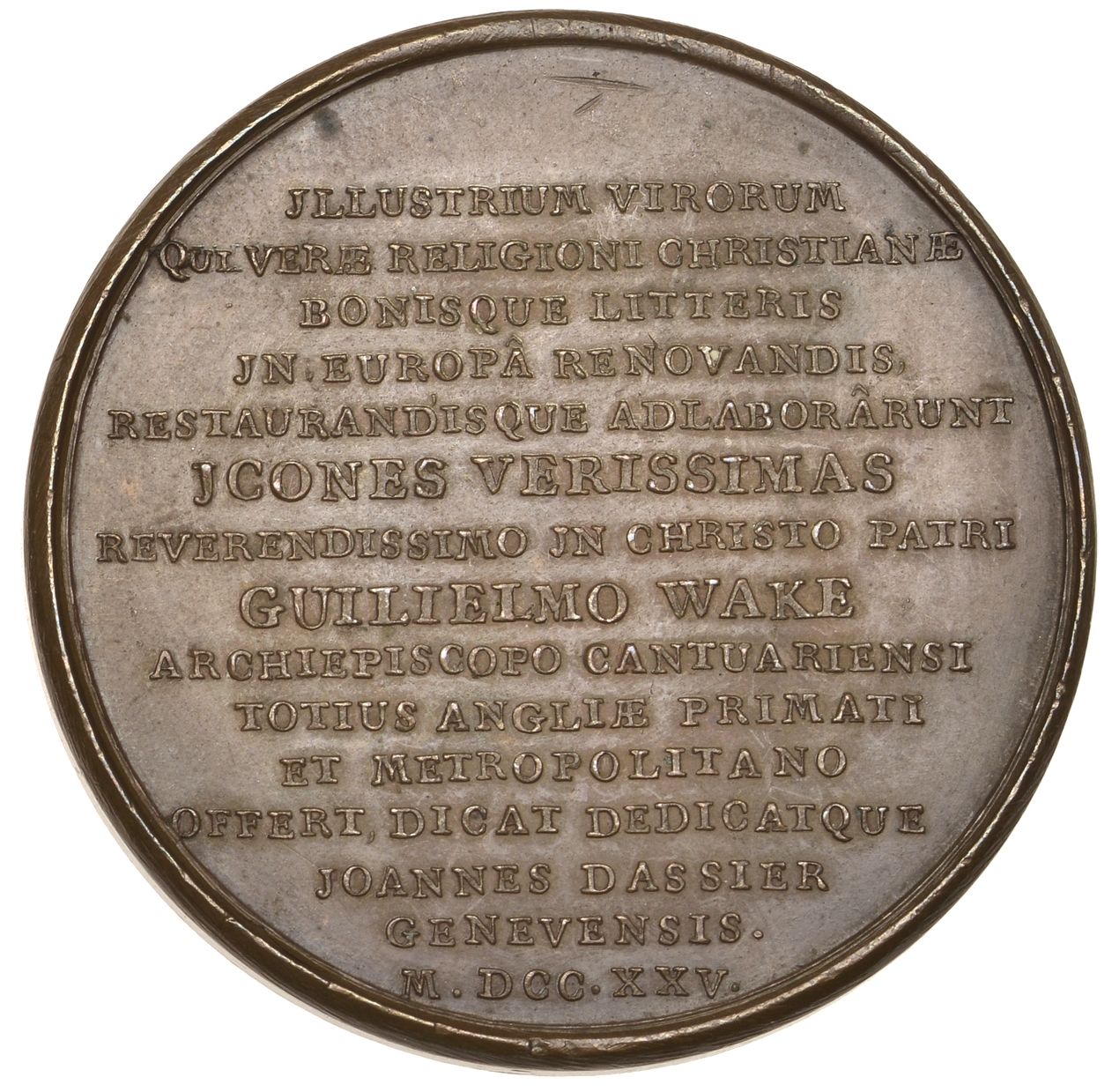 JLLUSTRIUM VIRORUM QUI VERÆ RELIGIONI CHRISTIANÆ BONISQUE LITTERIS JN EUROPA RENOVANDIS RESTAURANDISQUE ADLABORARUNT JCONES VERISSIMAS REVERENDISSIMO IN CHRISTO PATRI GUILIELMO WAKE ARCHIEPISCOPO CANTUARIENSI TOTIUS ANGLIÆ PRIMATI ET METROPOLITANO OFFERT, DICAT DEDICATQUE JOANNES DASSIER GENEYENSIS . M.DCC.XXV.