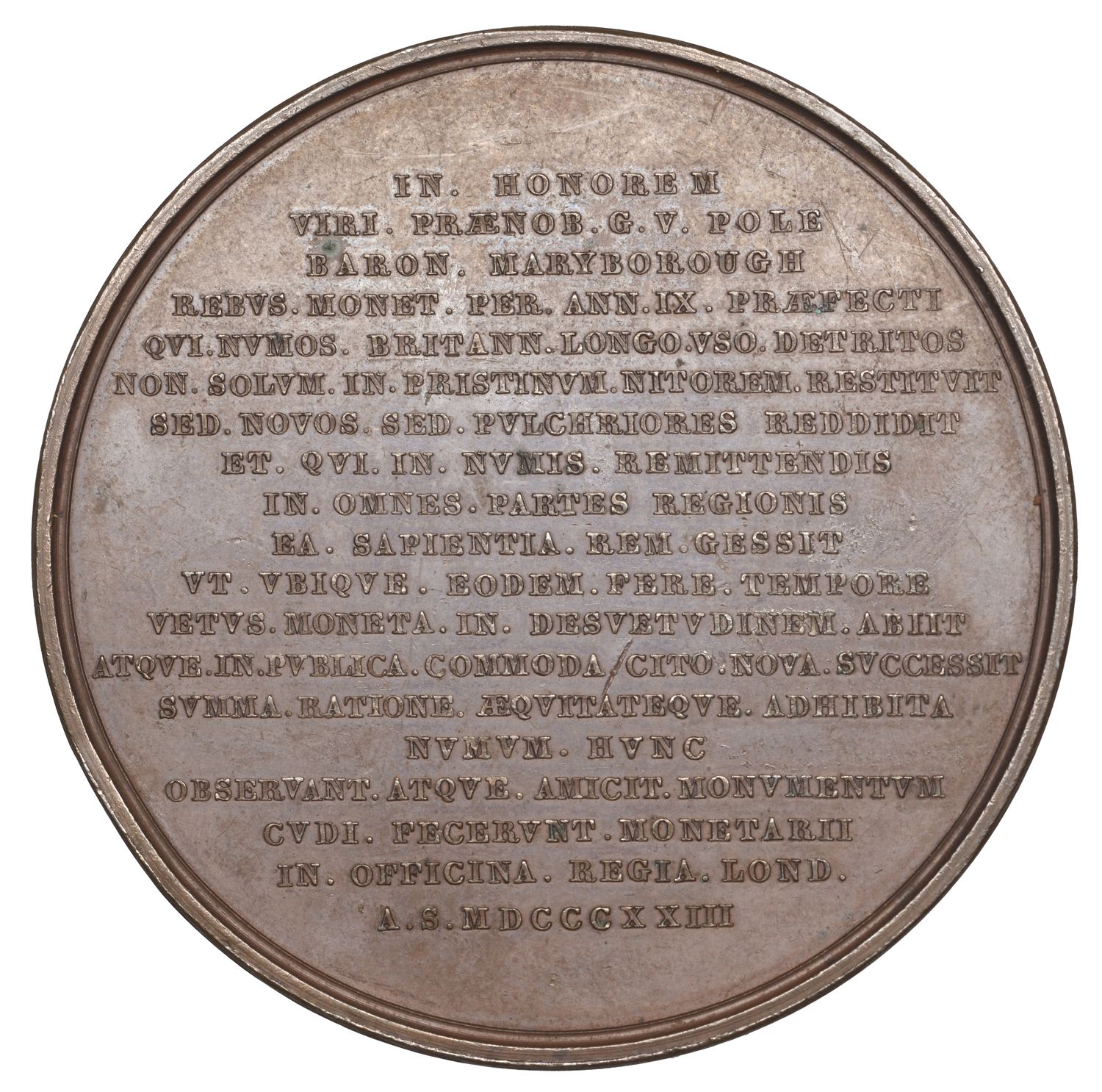 IN . HONOREM VIRI . PRAENOR . G . V . POLE BARON . MARYBOROUGH REBVS . MONET . PER . ANN . IX . PRAEPECTI QVLNVMOS : BRITANN . LONGO . VSO . DETRITUS NON . SOLVM . IN . PRISTINVM . NITOREM . RESTITVIT SED . NOVOS . SED . PVLCHRIORES REDDIDIT ET . QVI . IN . NUMIS . REMITTENDIS IN . OMNES . PARTES REGIONIS EA . SAPIENTIA . REM . GESSIT VT . VBIQVE . EODEM . FERE . TEMPORE VETVS . MONETA . IN DESVETVDINEM . ABUT ATQVE . IN PVBLICA . COMMODA . CITO . NOVA . ADHIBITA NVMVM . HVNC OBSERVANT ATQVE . AMICIT . MONVMENTVM CVDI FECERVNT . MONETARII IN . OFFICINA . REGIA . LOND A . S . MDCCCXXIII