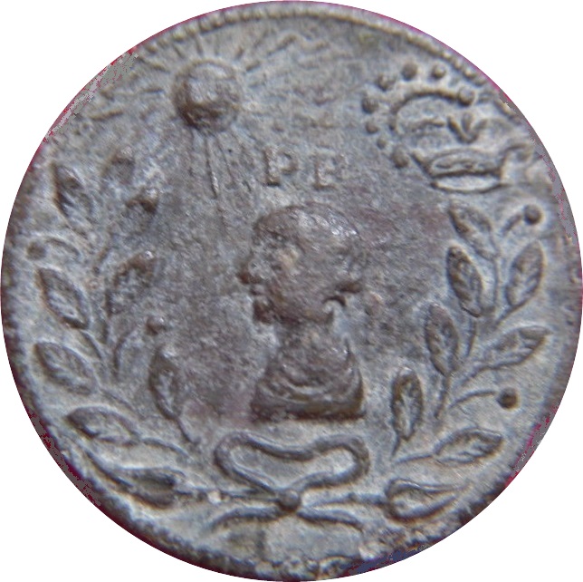 Описание: Драпированный бюст молодого принца Фредерика с непокрытой головой, обращенный влево, с его инициалами вверху, в открытом венке, солнце в левом верхнем углу, часть короны сзади в правом верхнем углу.