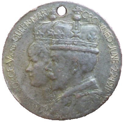 Описание: У центрі зображено земну кулю, оточену Британією в шоломі, що стоїть ліворуч, та крилатою Перемогою, що стоїть праворуч. Внизу зображено сонце з датою 1911 всередині та монограмою (GRM) королівського подружжя зверху.