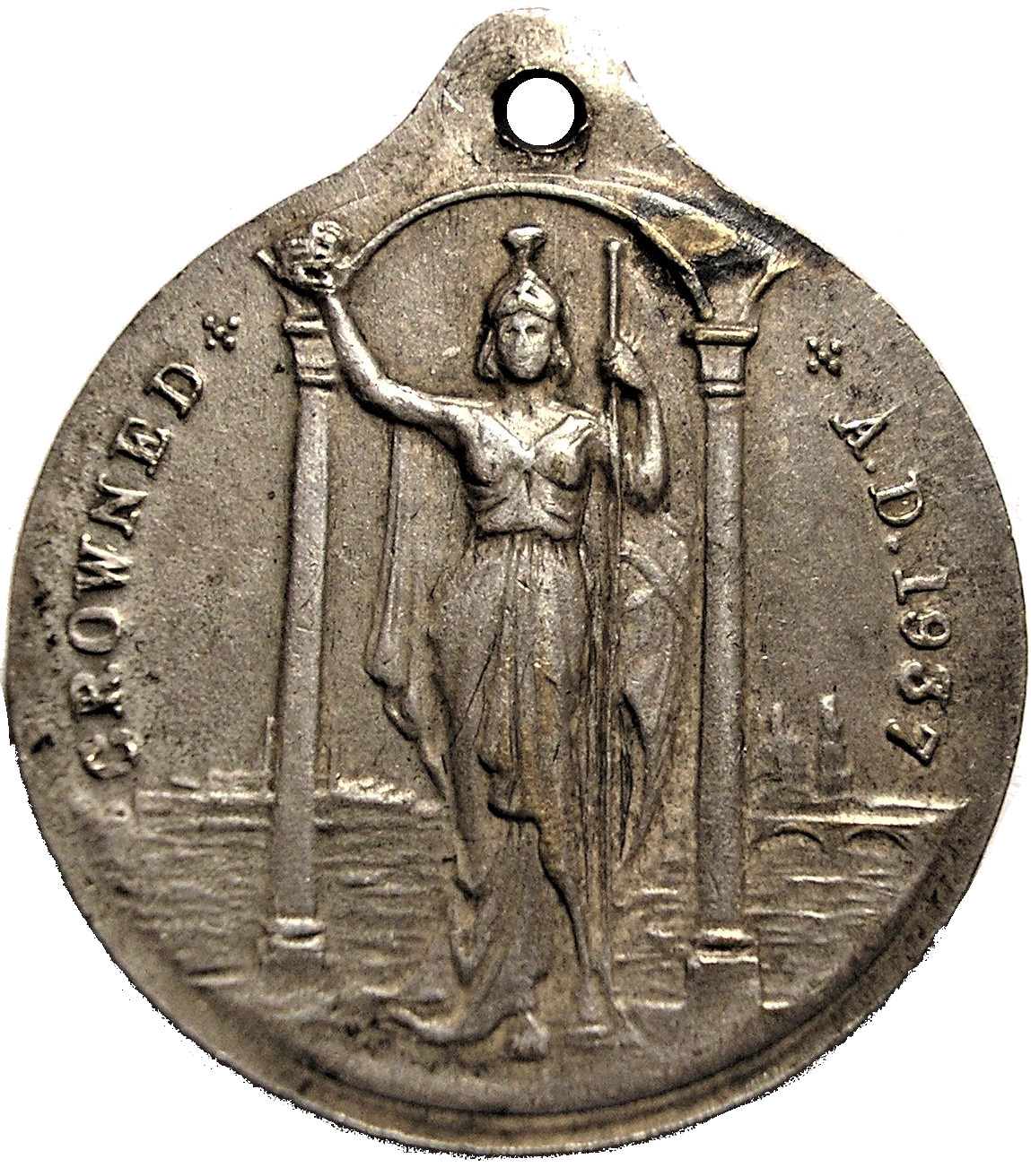 Описание: Британія стоїть анфас, тримаючи корону в арці [портику], перед сценою на березі Темзи, з собором Святого Павла та військовим кораблем вдалині, легенда по обидва боки малюнка.