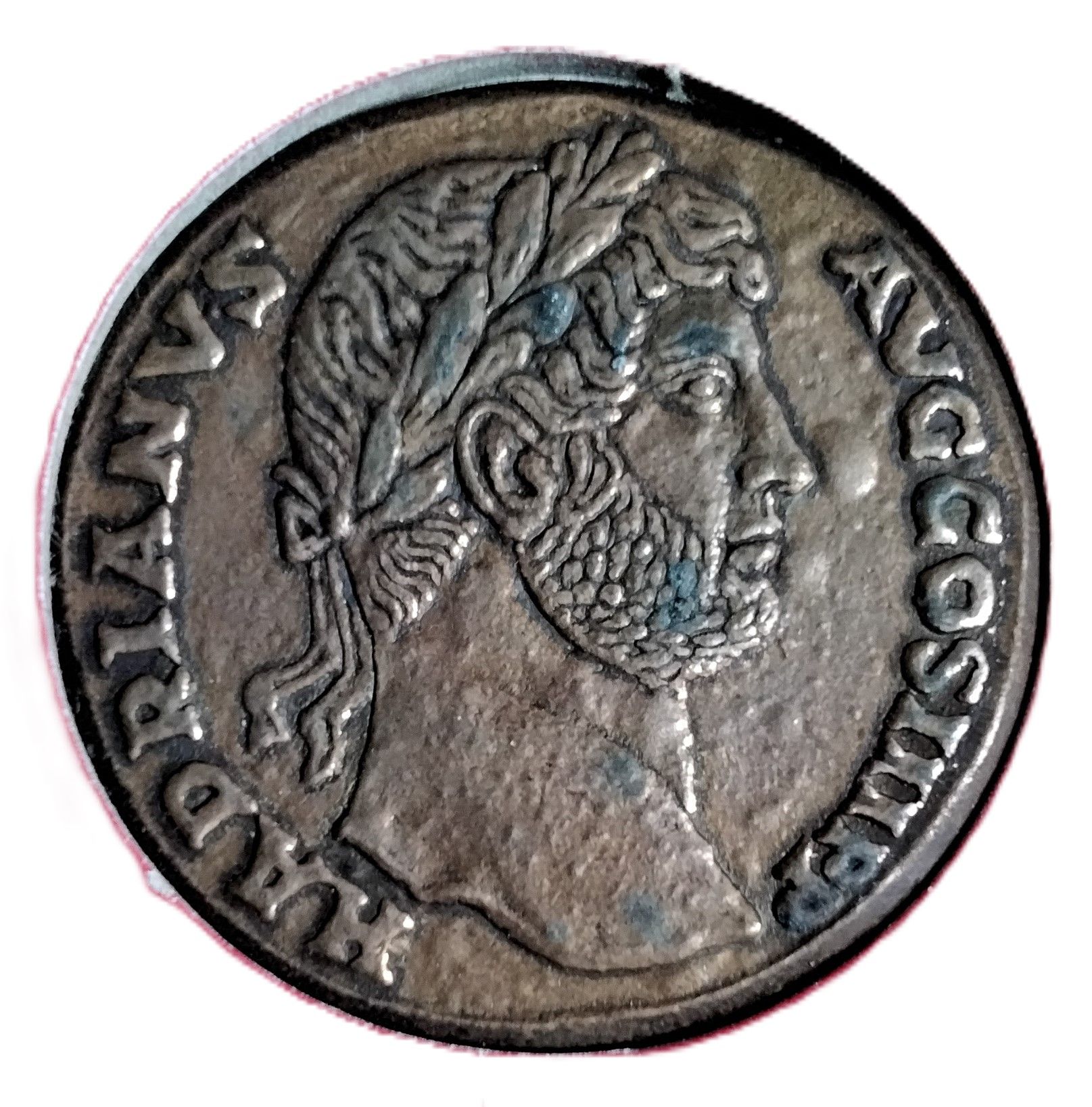 Описание: Голова Адриана в лавровом венке, обращенная вправо.
