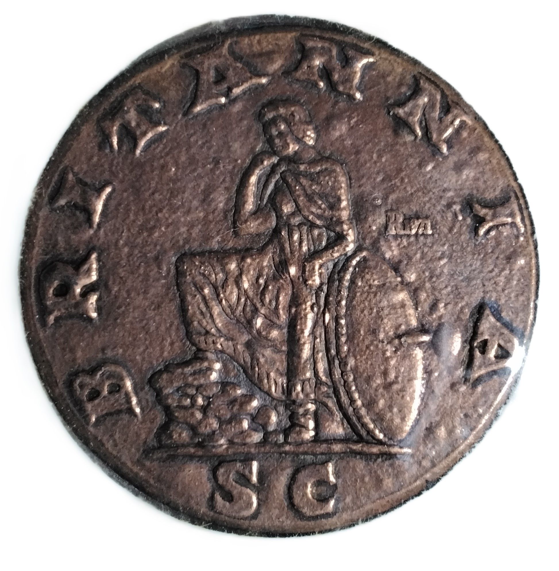 Описание: Британия сидит на скалах, обращенная влево, опираясь ногой либо на варвара, либо на скалы, подтягивая капюшон birrus Britanicus, держа копье; слева от нее — большой щит с шипом в центре. Клеймо монетного двора справа от Британии.