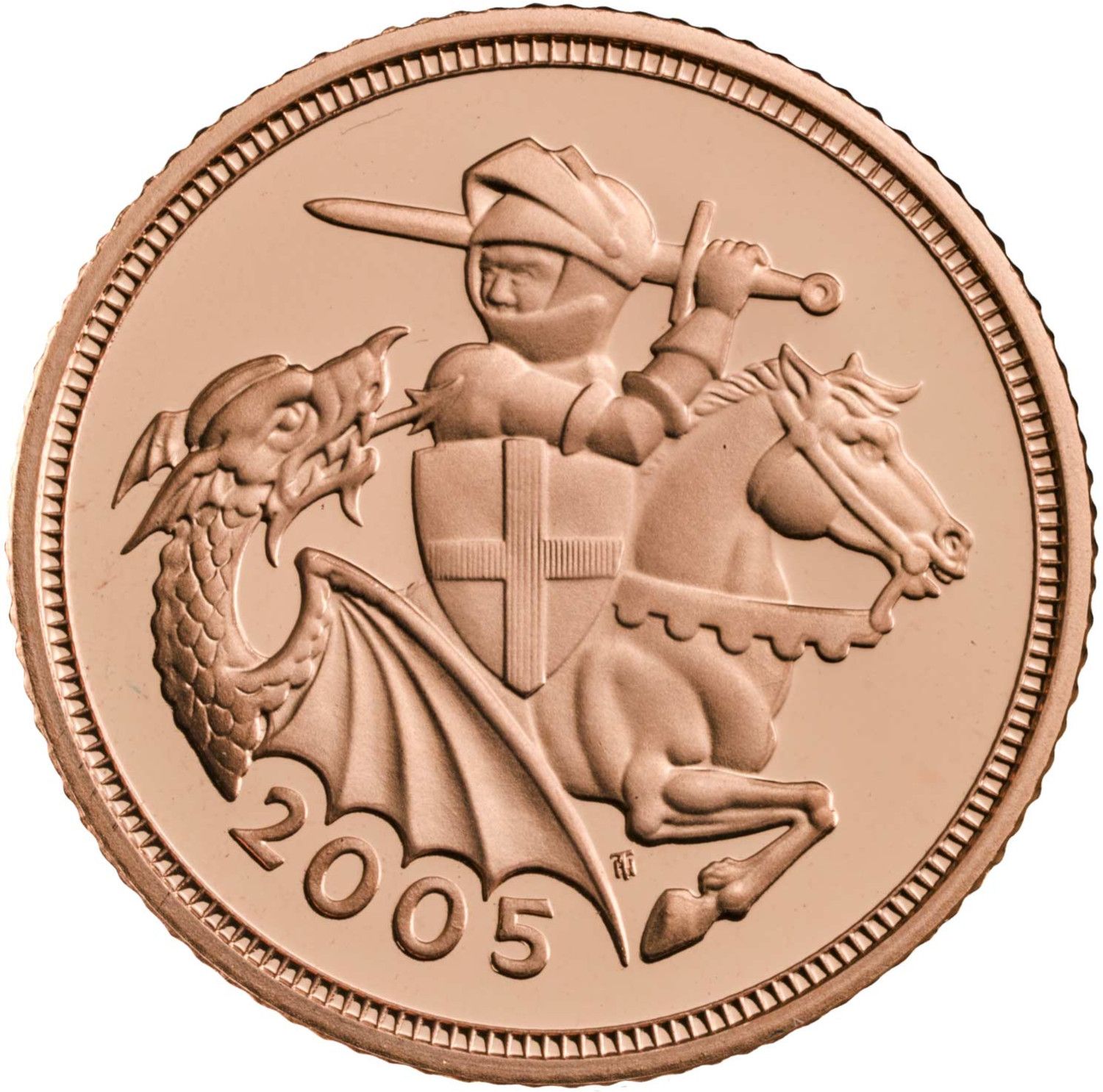 Описание: Модернизированное изображение Святого Георгия на коне, убивающего дракона, с датой под крылом дракона.
