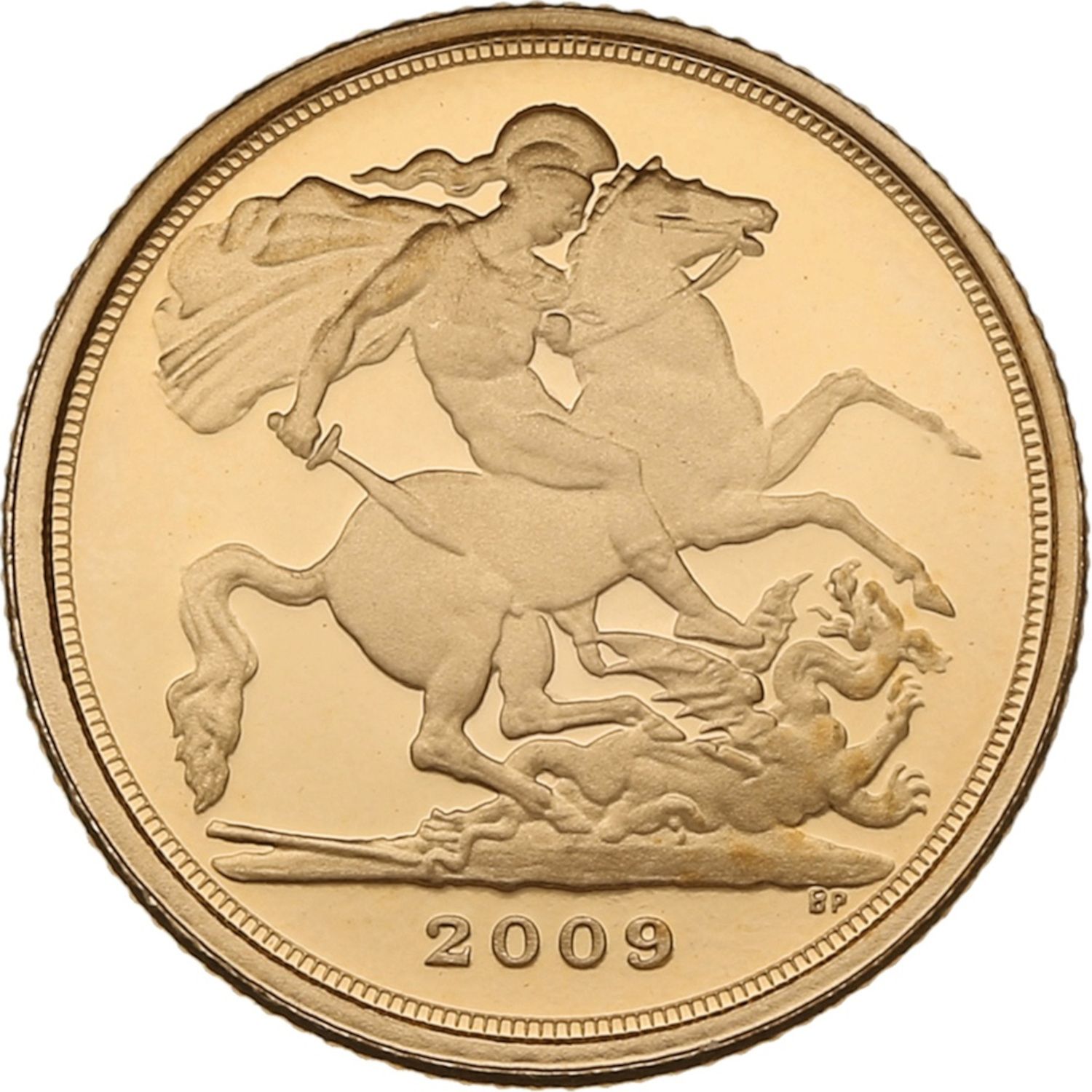 Описание: Святий Георгій, сидячи на коні, вбиває дракона мечем, зламана спис лежить на землі, дата та ініціали гравера в екзергу.