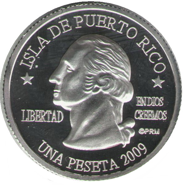 Описание: Портрет Джорджа Вашингтона, первого президента США с 1789 по 1797 год, в профиль слева сопровождается девизом «EN DIOS CREEMOS» и надписью «LIBERTAD» и окружен номиналом и надписью «ISLA DE PUERTO RICO».