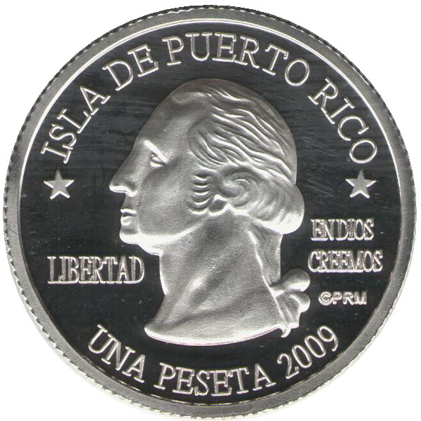 Описание: Портрет Джорджа Вашингтона, первого президента США с 1789 по 1797 год, в профиль слева сопровождается девизом «EN DIOS CREEMOS» и надписью «LIBERTAD» и окружен номиналом и надписью «ISLA DE PUERTO RICO».