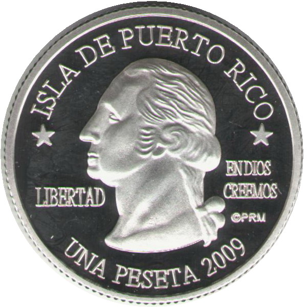 Описание: Портрет Джорджа Вашингтона, первого президента США с 1789 по 1797 год, в профиль слева сопровождается девизом «EN DIOS CREEMOS» и надписью «LIBERTAD» и окружен номиналом и надписью «ISLA DE PUERTO RICO».