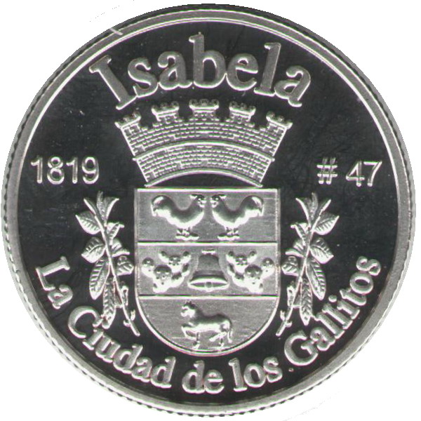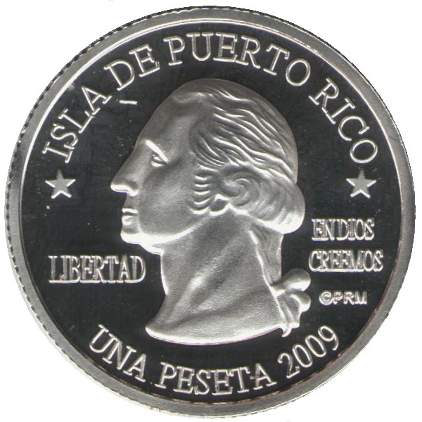 Описание: Портрет Джорджа Вашингтона, первого президента США с 1789 по 1797 год, в профиль слева сопровождается девизом «EN DIOS CREEMOS» и надписью «LIBERTAD» и окружен номиналом и надписью «ISLA DE PUERTO RICO».