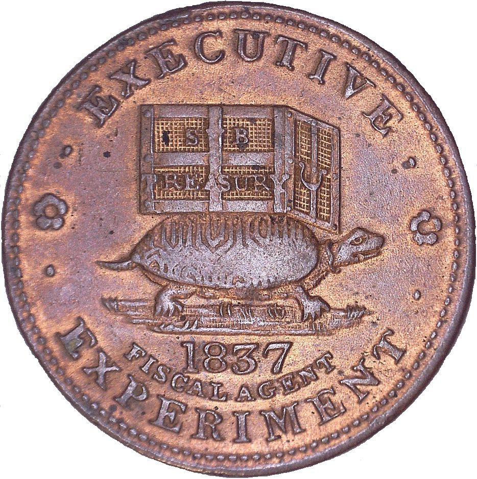 Описание: Черепаха, що несе великий сейф з написом «SUB TREASURY» праворуч. Дата внизу, напис навколо, облямівка з намистинами.
