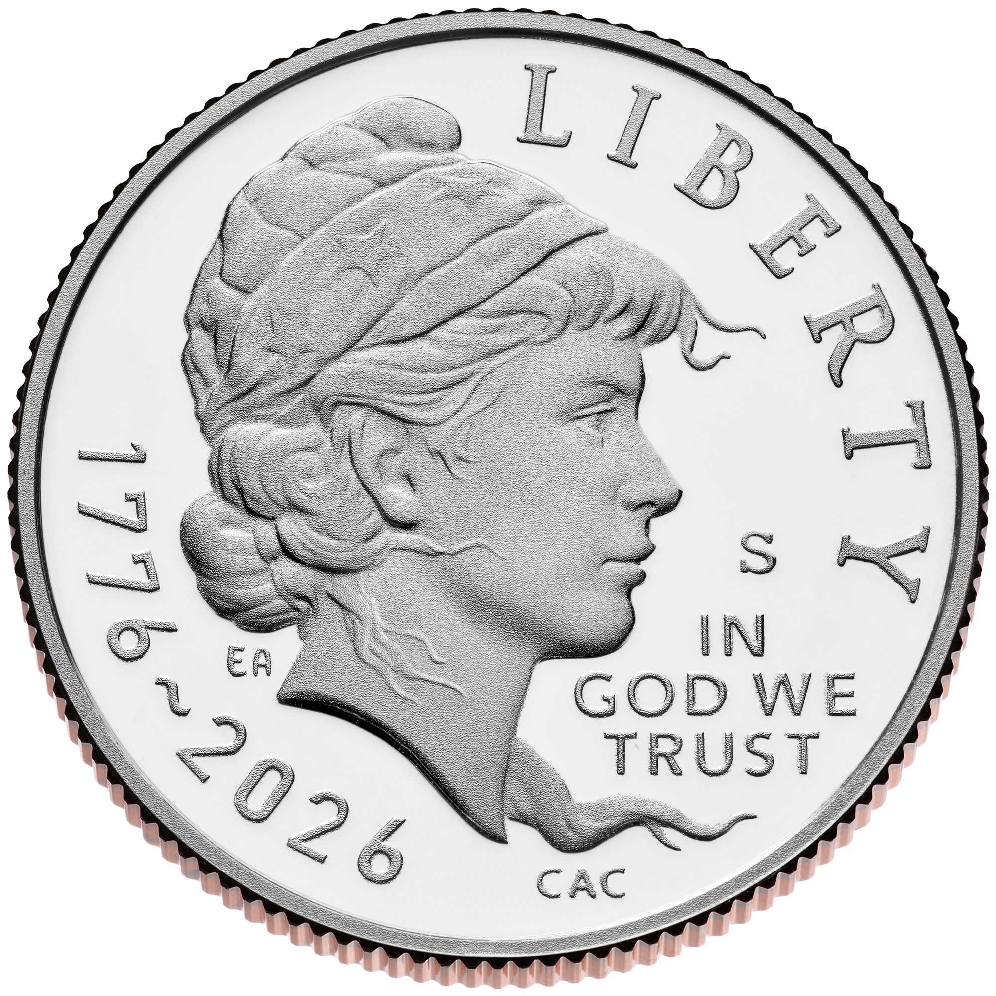Описание: На аверсе монеты изображена решительная Свобода, чьи волосы развевает ветер революции. С непоколебимой решимостью она противостоит тирании британской монархии. Ее шапка свободы украшена звездами и полосками, что одновременно является символом нашей молодой нации и отсылкой к ранним американским монетам.
