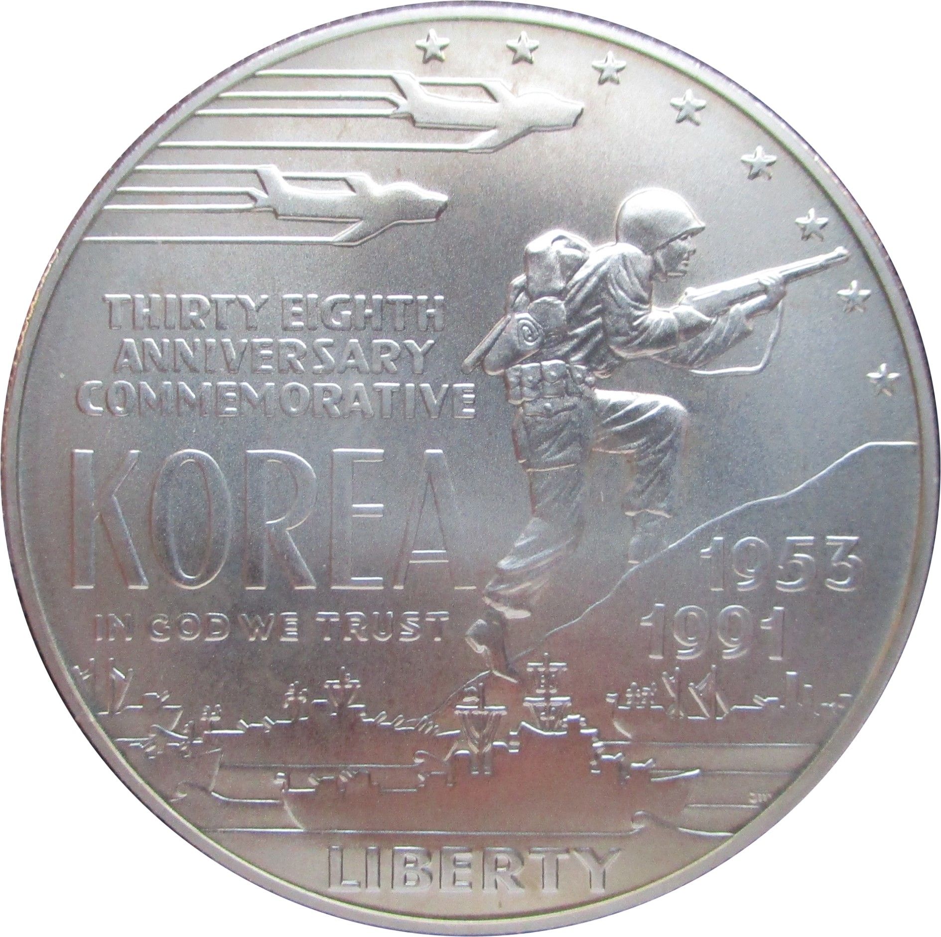 Описание: Карта Кореи с разделением по 38-й параллели и корейским символом Тэгык, эквивалентным китайскому символу Тайцзи, олицетворяющему единство противоположностей (инь и янь). Справа от карты изображена голова орла.