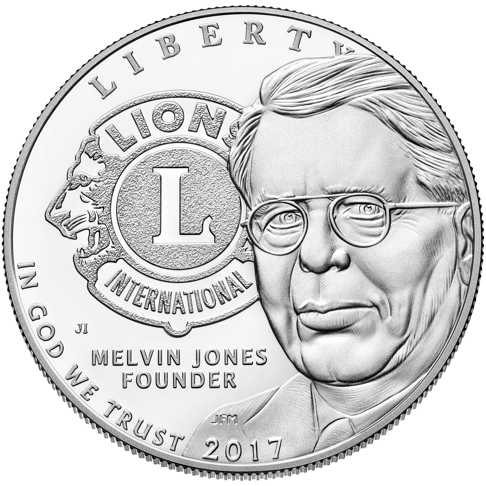 Описание: Портрет засновника Мелвіна Джонса в поєднанні з логотипом Lions Clubs International.