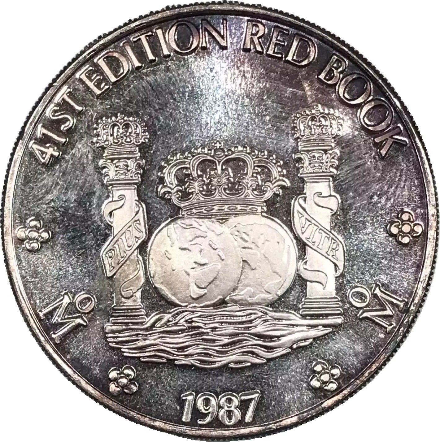 Описание: Короновані півкулі, оточені коронованими стовпами над хвилями. Зображення квітів та два знаки монетного двору Мехіко.