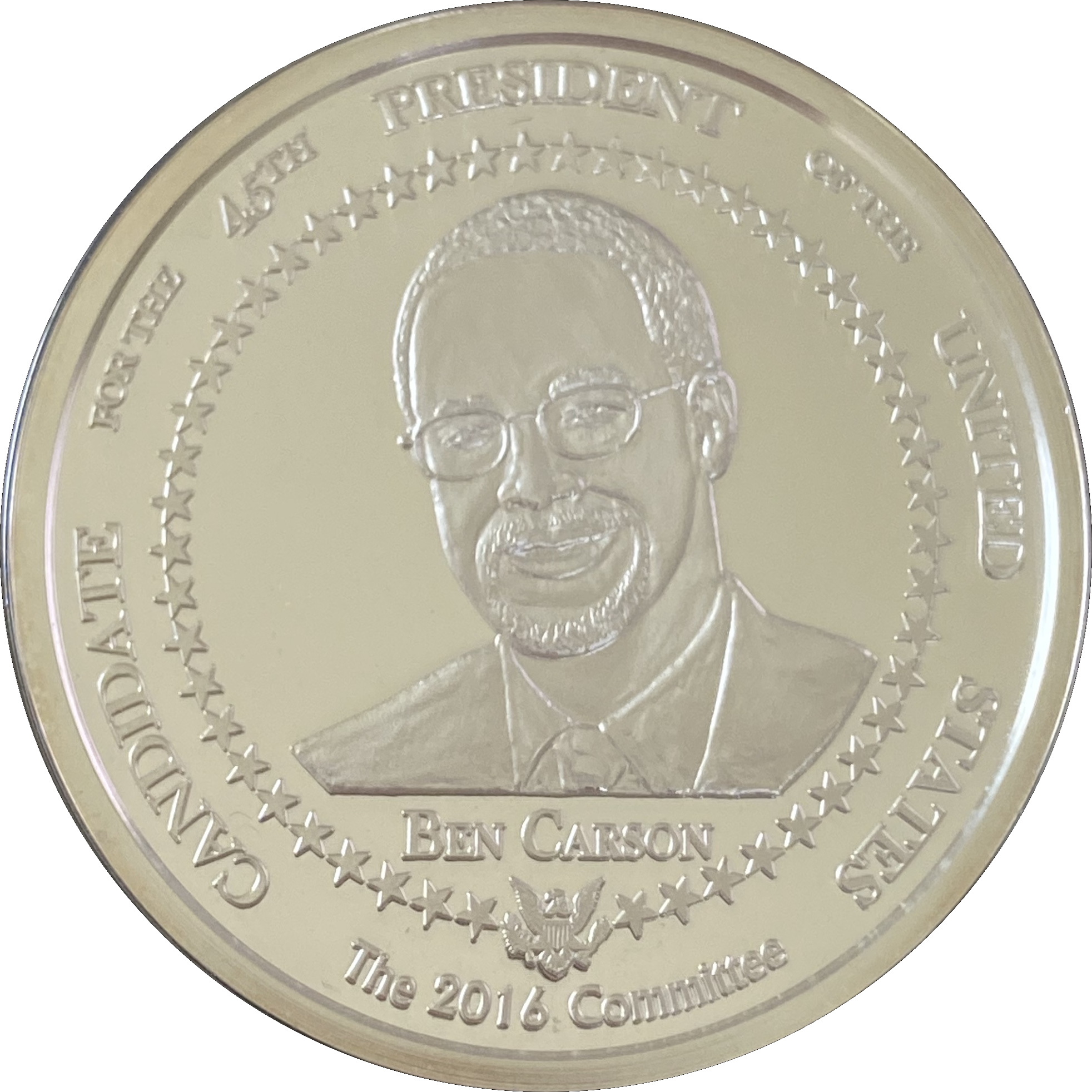 Описание: Портрет Бена Карсона, оточений 50 зірками, з президентською печаткою під портретом, що з'єднується із зірками з обох боків.