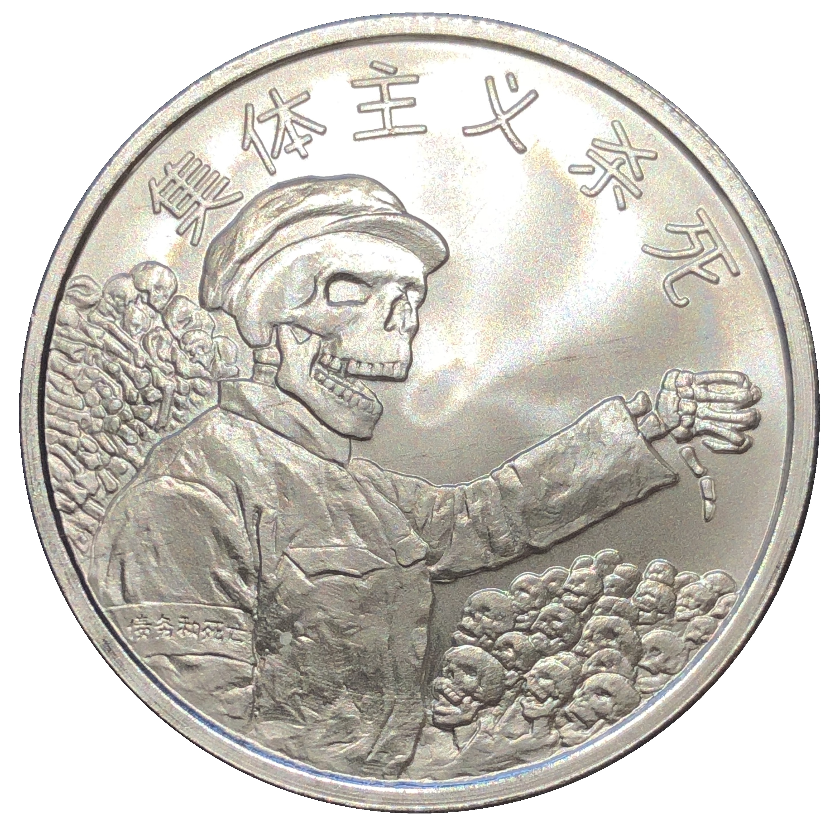 Описание: Скелет голови Мао, одягнений у свій фірмовий плащ з пов'язкою на руці з написом «Борг і смерть». За ним лежить купа кісток його жертв, а перед ним стоять охочі та співучасні маси, які чекають на його наказ, щоб вчинити чергове звірство. У верхній частині монети є китайські ієрогліфи, які перекладаються як «Колективізм вбиває».