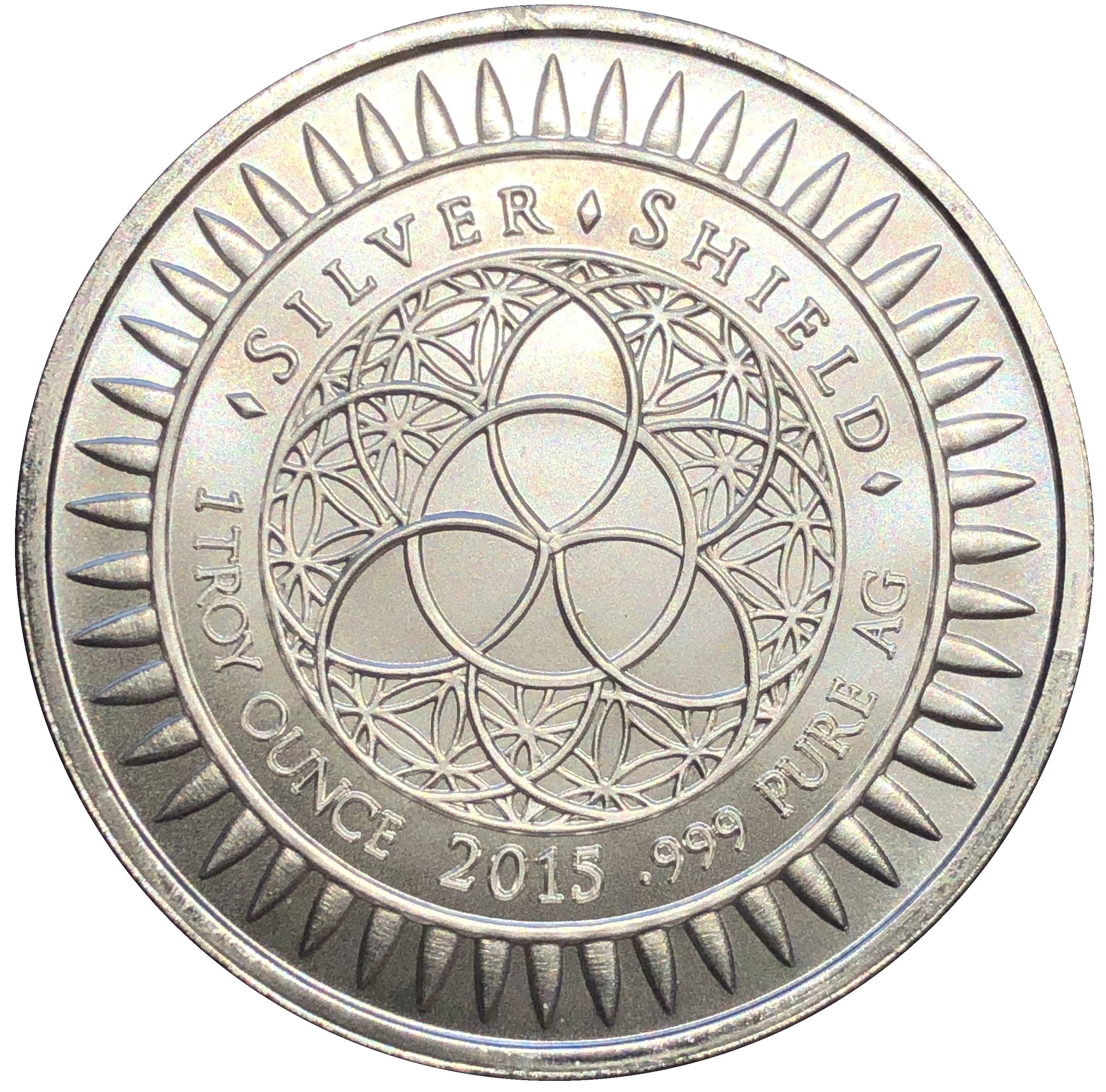 Описание: Логотип Silver Shield із тривіумом у центрі, оточений словами «Silver Shield 1 Troy ounce 2015 999 Pure AG» та 47 кулями.