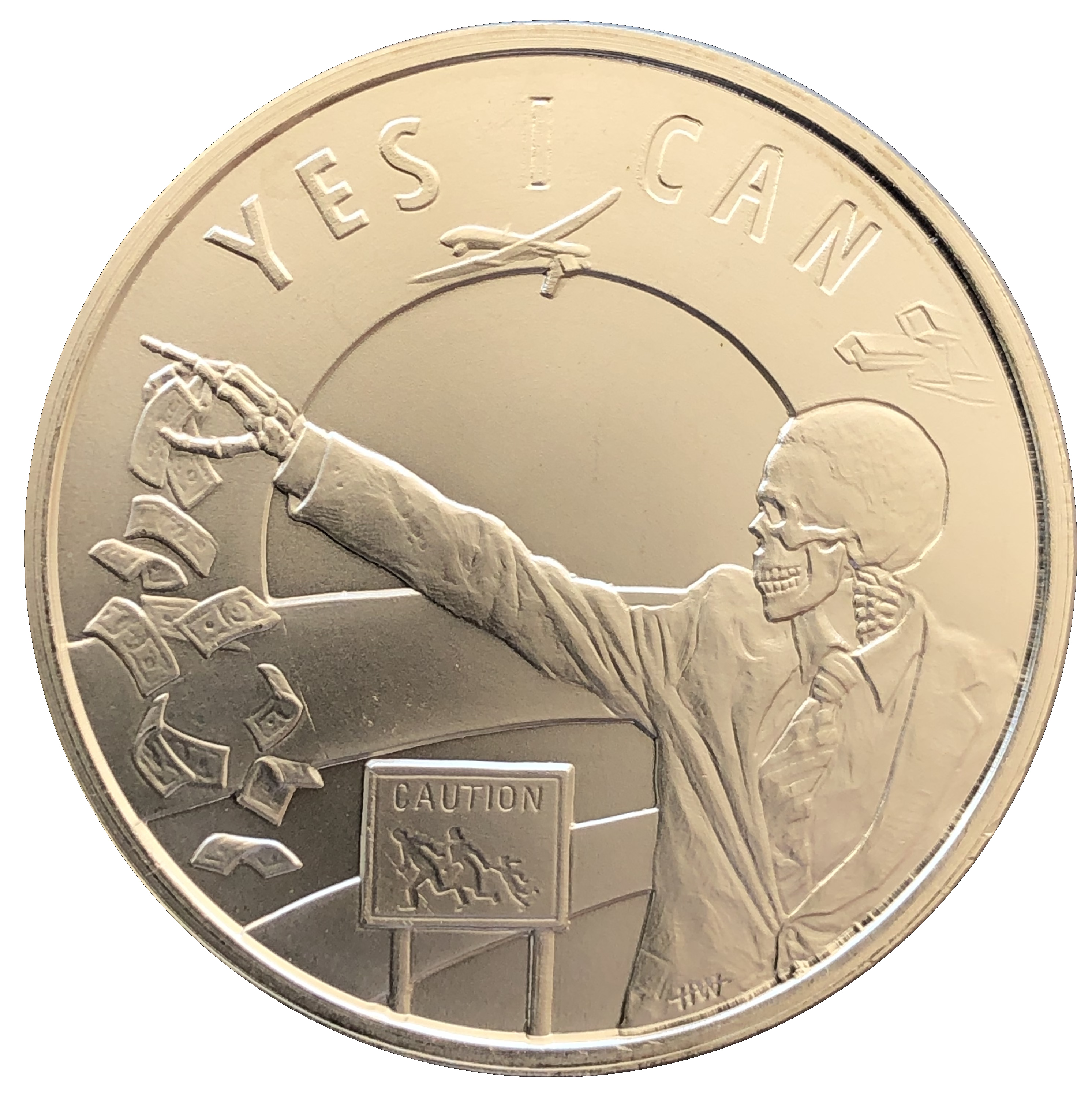 Описание: Скелет Обами з витягнутою рукою, з якої недбало випадають гроші. У верхній частині кола розміщено слова «Yes I can» (Так, я можу), а також камери спостереження та дрон. У нижній частині зображено знак «Обережно» та сім'ю, яка рятується втечею.