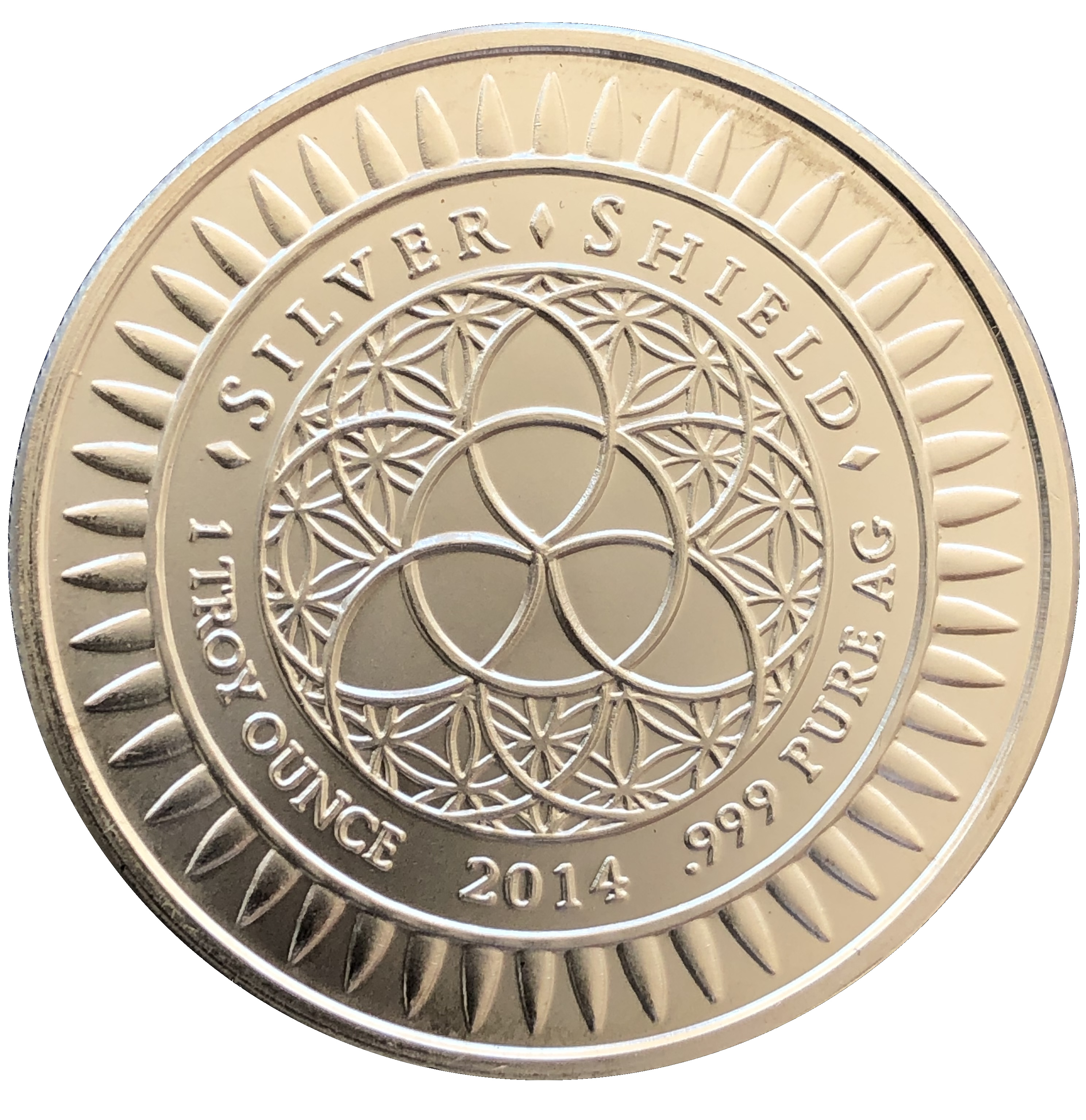 Описание: Логотип Silver Shield із тривіумом у центрі, оточений словами «Silver Shield 1 Troy ounce 2015 999 Pure AG» та 47 кулями.