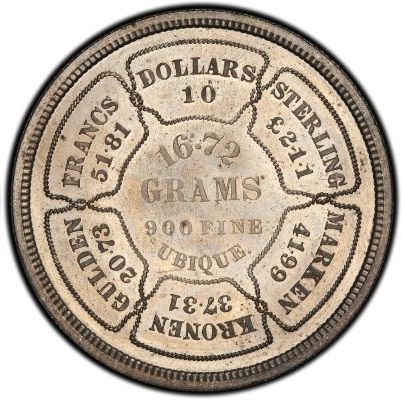 Описание: Веревка делит реверс на шесть сегментов. «16,72» над «GRAMS» над «900 FINE» над «UBIQUE» в центре. Сегмент 1: «DOLLARS» над «10», сегмент 2: «STERLING» над «£2·1·1», сегмент 3: «MARKEN» над «41·99», сегмент 4: «KRONEN» над «37·31», сегмент 5: «GULDEN» над «20·73» и сегмент 6: «FRANCS» над «51·81».