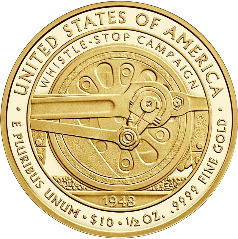 Описание: Изображение колеса локомотива, движущегося по железнодорожным путям. Это изображение символизирует поддержку г-жи Трумэн своему мужу во время его предвыборной кампании 1948 года, когда он баллотировался на повторное избрание президентом.