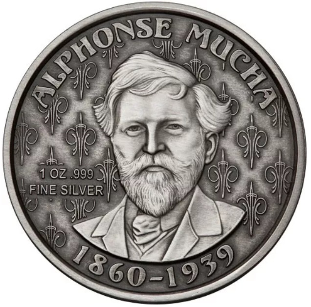 Описание: На аверсі срібної монети «Танцююча» з колекції «Антична Муха» вагою 1 унція зображено Муху, взяте з реальної фотографії чеського художника в натуральну величину. Для серії монет було обрано крупний план його голови, оточений гравіюванням його імені, року народження, року смерті, ваги, вмісту металу та чистоти.