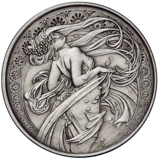 Описание: «Танець» був четвертим дизайном у серії Мухи, відомій як «Мистецтва». Інші фігури, включені в цю чотиричастину серію зображень, включають «Живопис», «Поезію» та «Музику». Як і всі жінки Мухи, «Танець» випромінює красу своєю фігурою і вважається багатьма однією з найспокусливіших жінок, яких він коли-небудь малював. На зворотному боці всіх срібних монет «Танець» з колекції Мухи зображено витончену фігуру та довге, хвилясте волосся Танцю. Вона зображена, дивлячись через плече на вас, її фігура напружена, вона стоїть на носочках, а її каштанове волосся розвівається на вітрі.