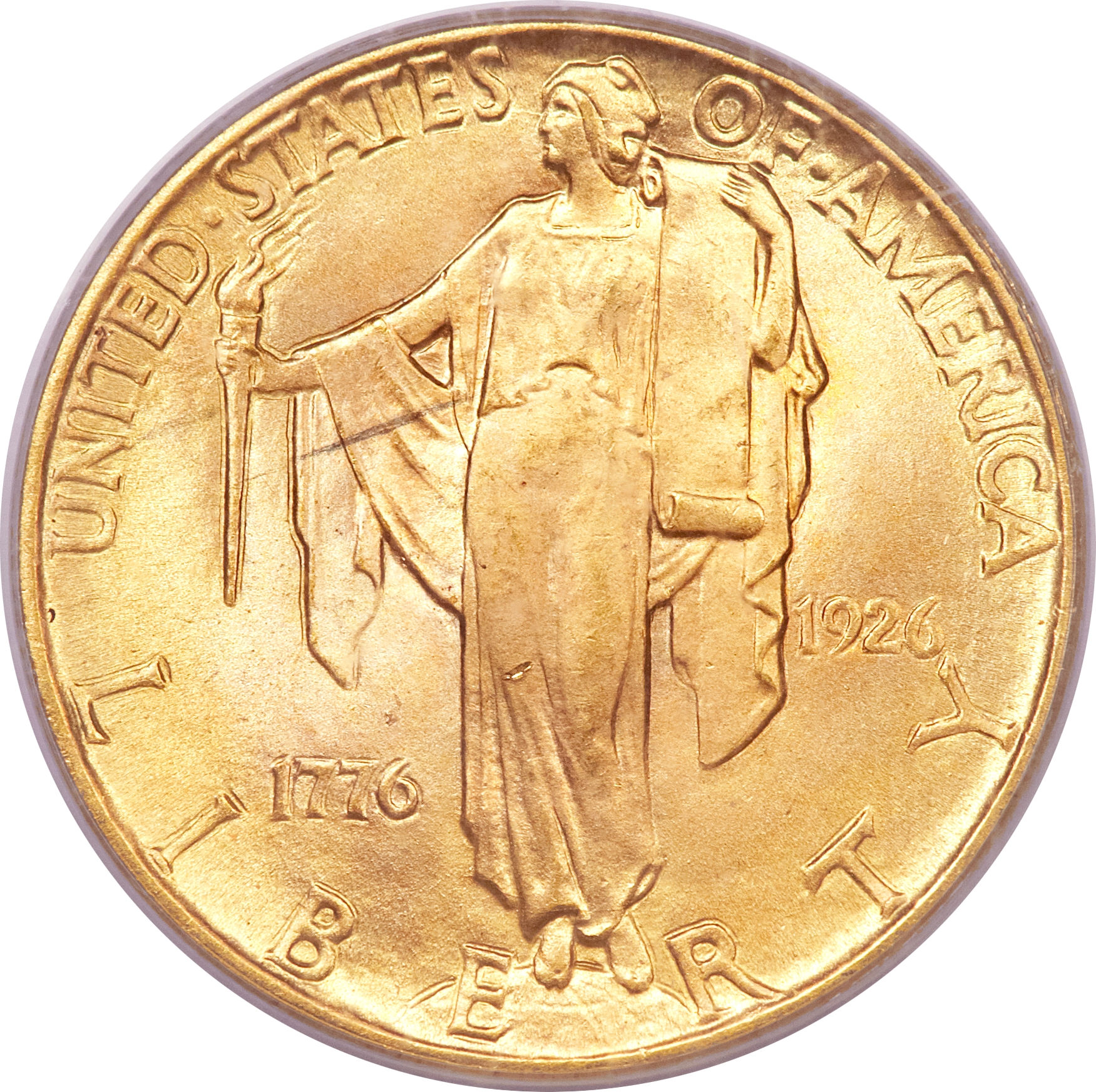 Описание: Свобода стоит на части земного шара. В одной руке она держит свиток, символизирующий Декларацию независимости, а в другой — зажженный факел.